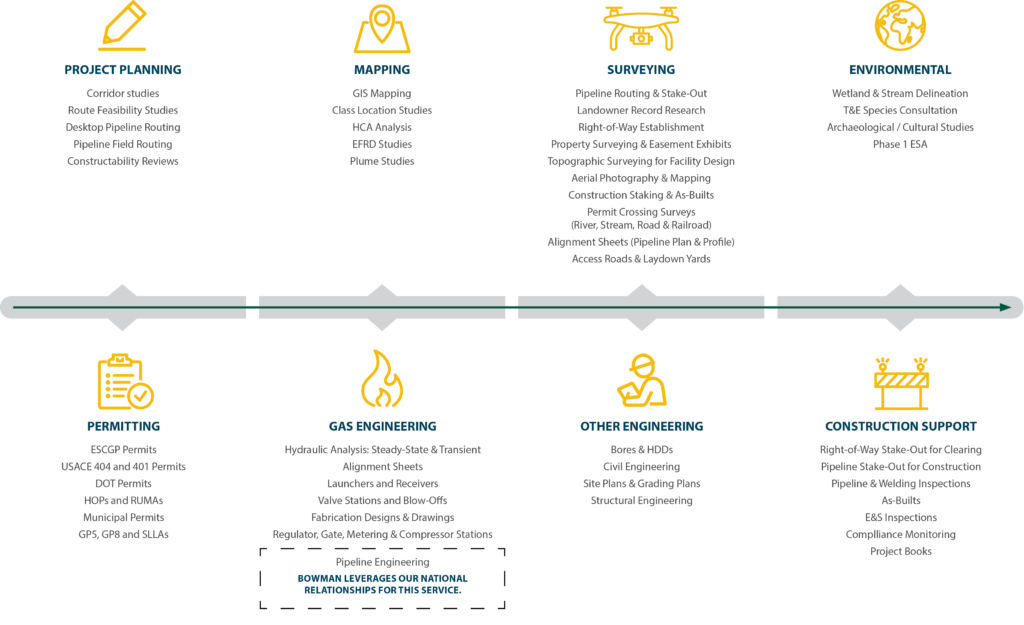 Bowman applies leading technologies and industry best practices to address the unique needs of each project. Our team is committed to helping drive innovation in the industry while holding stringent environmental standards. We prioritize eco-friendly practices throughout the project life cycle, from design and engineering to implementation and maintenance. Partner with us and unlock sustainable growth opportunities for your oil and gas operations.