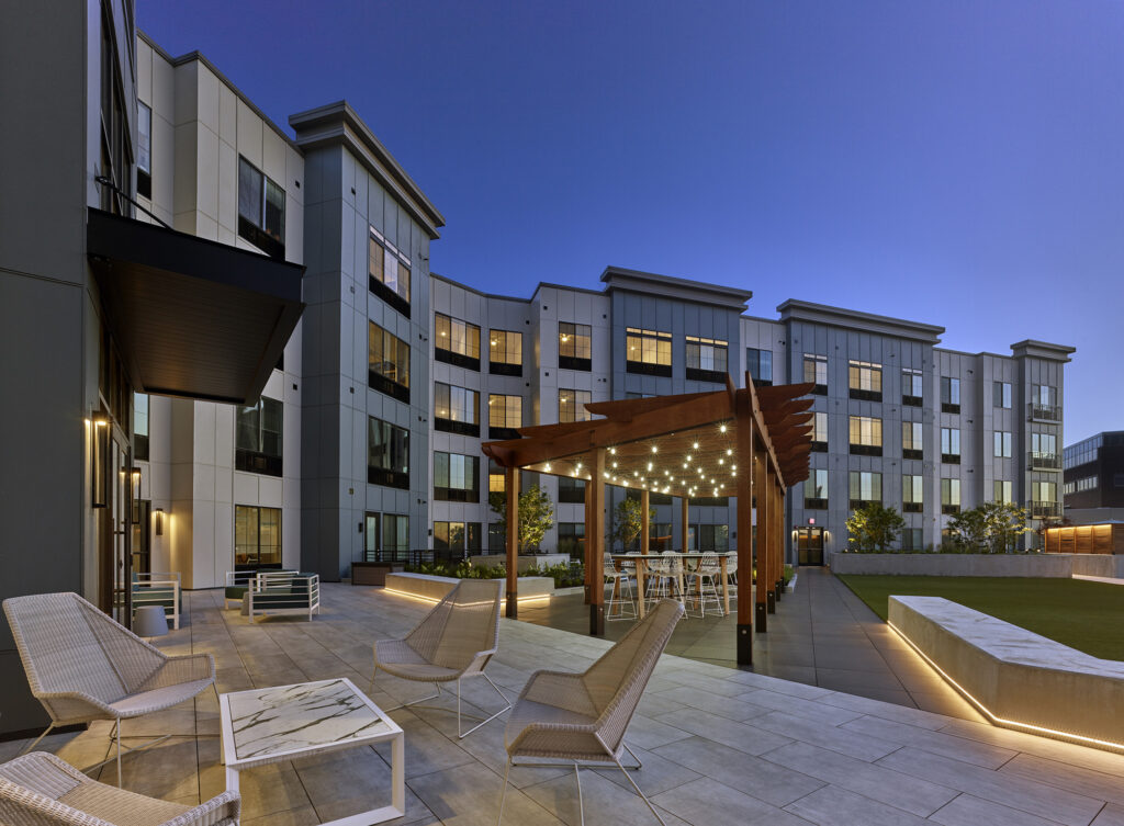 REVA Rahway is a new multi-family residential building, situated on 3.5 acres of land in downtown Rahway. The project includes 219 residential units within a 5-story building with two exterior amenity spaces. Both amenity spaces are situated at the second floor. The eastern courtyard is the active amenity space and includes multiple seating areas, a fire table, high table communal dining with pergola above, a large panel of lawn for sunbathing, three private dining and grilling areas, and a private living room area with an outdoor television. The western courtyard is more passive and includes a large communal lounge seating area with two additional smaller lounge seating areas. Screen walls enhance the privacy of both the resident’s units and the users of the amenity space. Each of these spaces provides residents with specific areas to socialize, dine and relax.