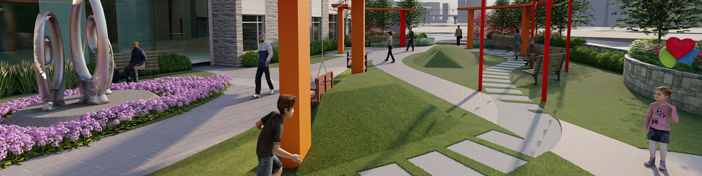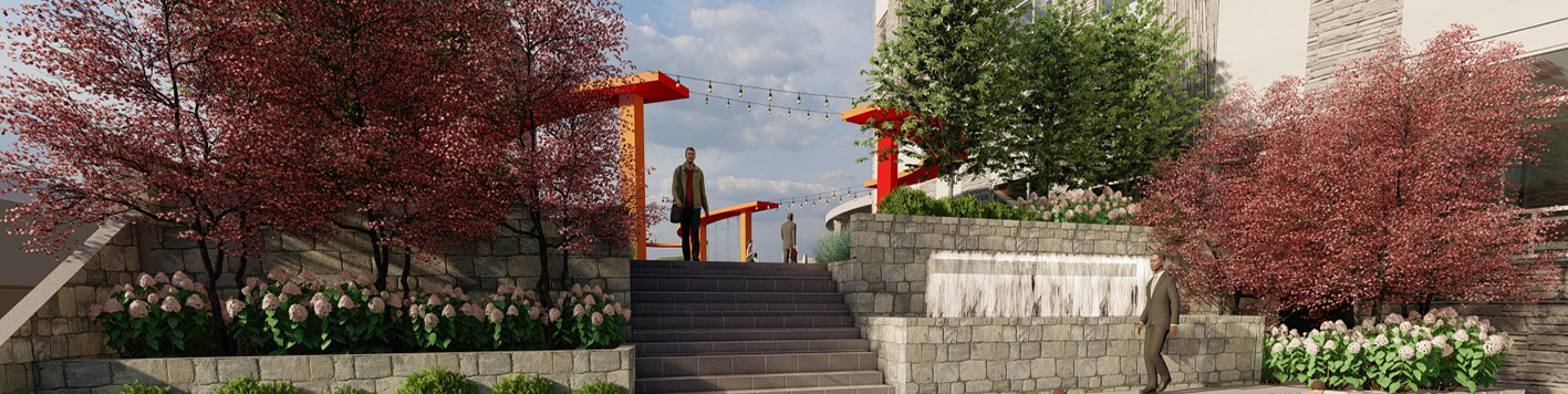 Pedestrian access from International Drive extends across the publicly-accessible plaza at grade-level and connects up to a second publicly-accessible plaza on top of the one-story parking podium. A large green, open space area extends along the western boundary to accommodate fire lane access and serve as a dog walk or passive recreation area. The lower, 11-story wing in the southeast corner of the site has been sited along Watson Street with a step-back at the 4th floor to establish a building base suitable for an urban street front with human-scale proportion. The lower Watson Street wing connects to a 23-story tower oriented along the western property line with a circular corner feature that extends from the sidewalk to the full height of the tower.