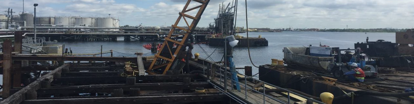 Kinder Morgan Terminal dock 1 at Carteret, NJ is approximately 300 LF long and 30 ft wide, and timber pile supported high deck structure. A timber pile supported approach trestle connects the wharf to the land. The dock is used to service tanker barges and was in serious condition. Our team was retained to perform a thorough underwater inspection of Dock 1, review the construction and current condition of the existing dock and design the renewal of Dock 1 in a phased manner. The scope of work included developing several alternates for the construction of new breasting and mooring structures with the estimated construction costs for the client to review and select the most suitable alternate.