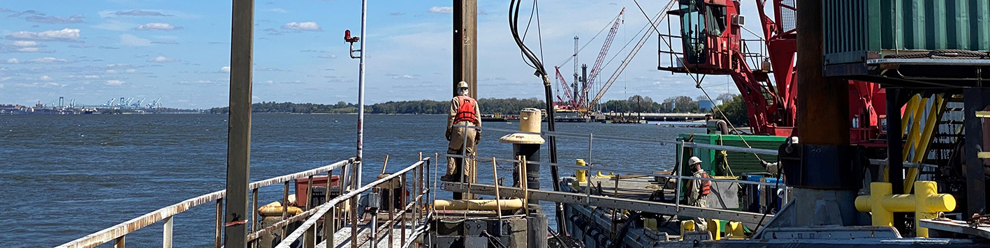 Bowman in Chadds Ford, PA started full time construction inspection for a project that we recently designed for PBF Logistics in New Jersey. The project involves construction of two mooring dolphins to tie up ships up to 750 ft long (LOA) and other associated construction work. Such construction work starts with the installation of falsework (temporary steel framing) to be able to install production piles at accurate locations and angles in the waterway. Above is a picture showing the marine contractor starting to install the falsework while floating and standing on water on timber mats. These men are exceptional since they do this work daily in extremely hot summer and extreme cold when the river is frozen.