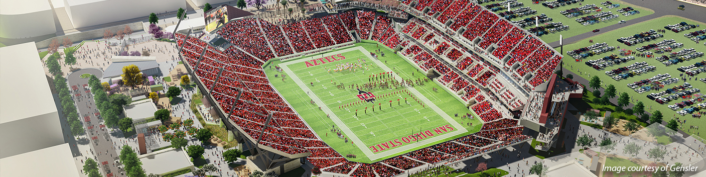 In addition to the design lead, we are providing civil engineering, land surveying, landscape architecture, and water resources services for the catalytic project that is the SDSU Master Plan and Aztec Stadium.